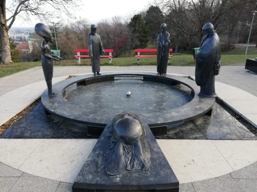 Nos abrigamos y cogemos un autobús que nos deja en las faldas de la colina de Gellért. Ahí, por un hermoso parque, caminamos por unos senderos señalizados con unas flechas (y no amarillas como las del camino de Santiago), poco a poco vamos pasando por miradores y una escultura en homenaje a personajes destacados y referentes de diferentes religiones del mundo.
