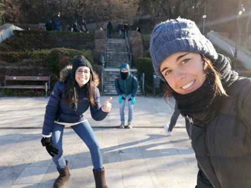 Salimos del spa y observamos que muy cerca hay una pista de patinaje sobre hielo. 11 euros cuesta acceder y alquilar el material.