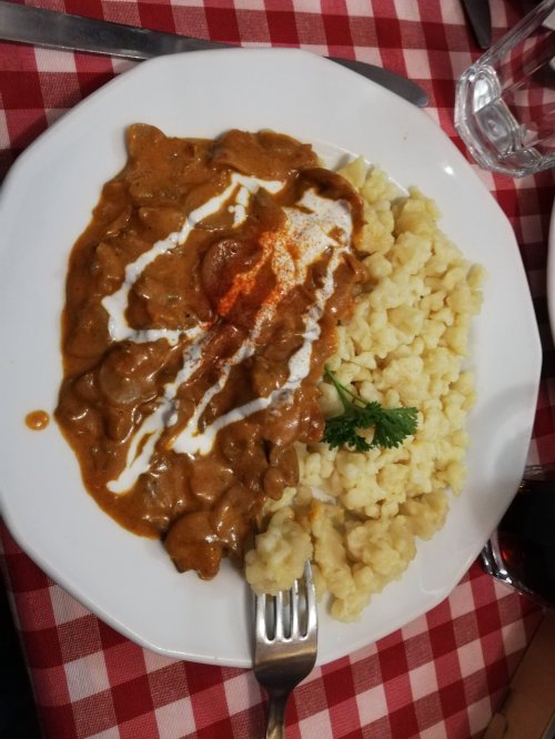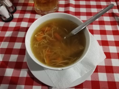 Acabamos cenando en un bar tranquilo y húngaro de la zona. Comemos una especie de canalón en pasta de crep y una sopa de fideos con pollo.