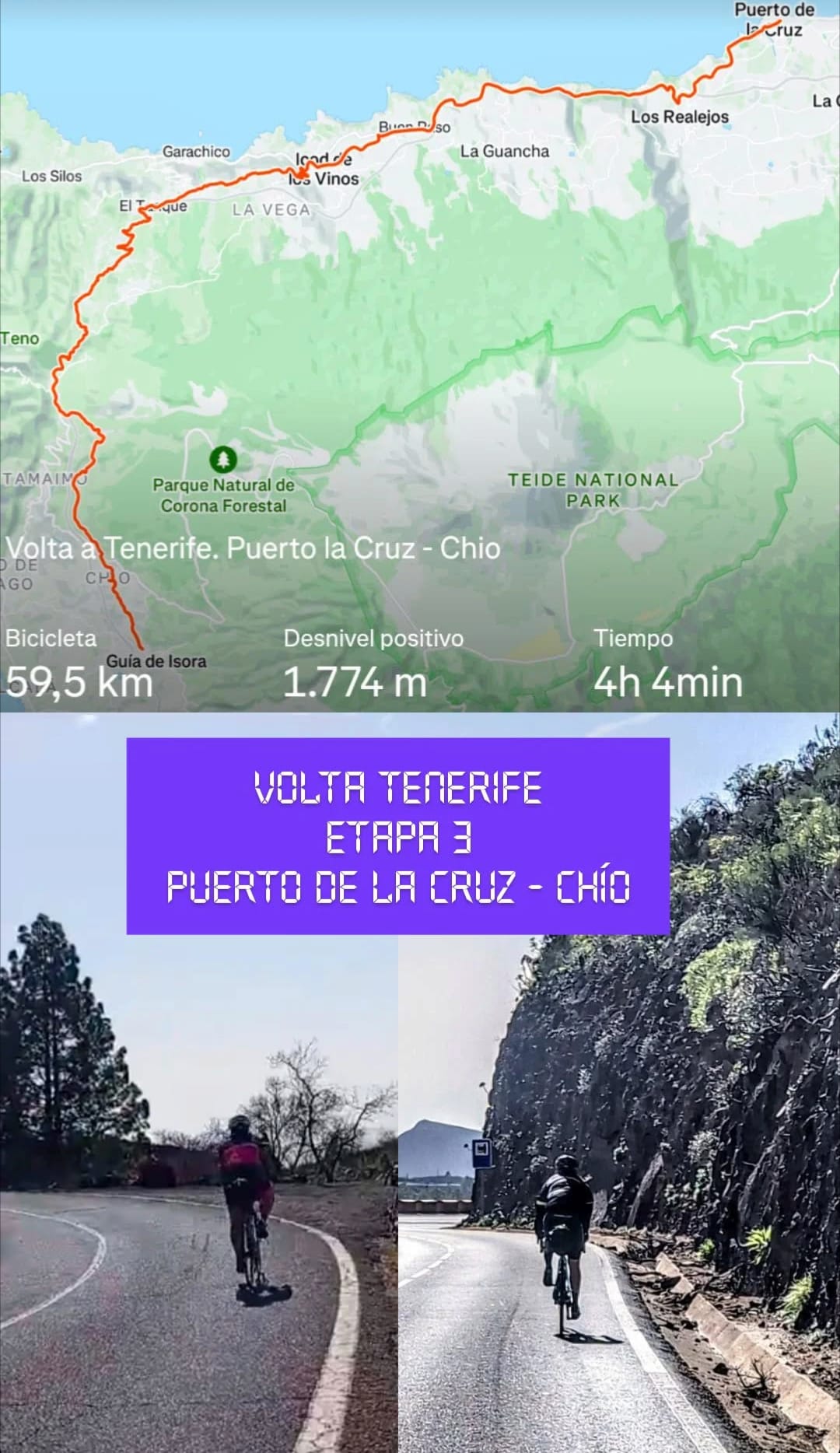La etapa de hoy sabíamos que iba a ser dura. Pero la verdad es que lo más duro, fue salir de Puerto de la Cruz, ya que tiene algunas rampas interesantes, pero es justo al principio. Luego el camino va en constante subida, pero se hace bastante bien. Los primeros 20 km vienen con subidas y bajadas y luego llegan 18 km de subida constante, pero de fácil pedaleo. Después de esto, una pequeña bajada hasta Santiago del Teide para remontar unos 3 km y empezar la bajada hasta Chío, siempre siguiendo la T-28.