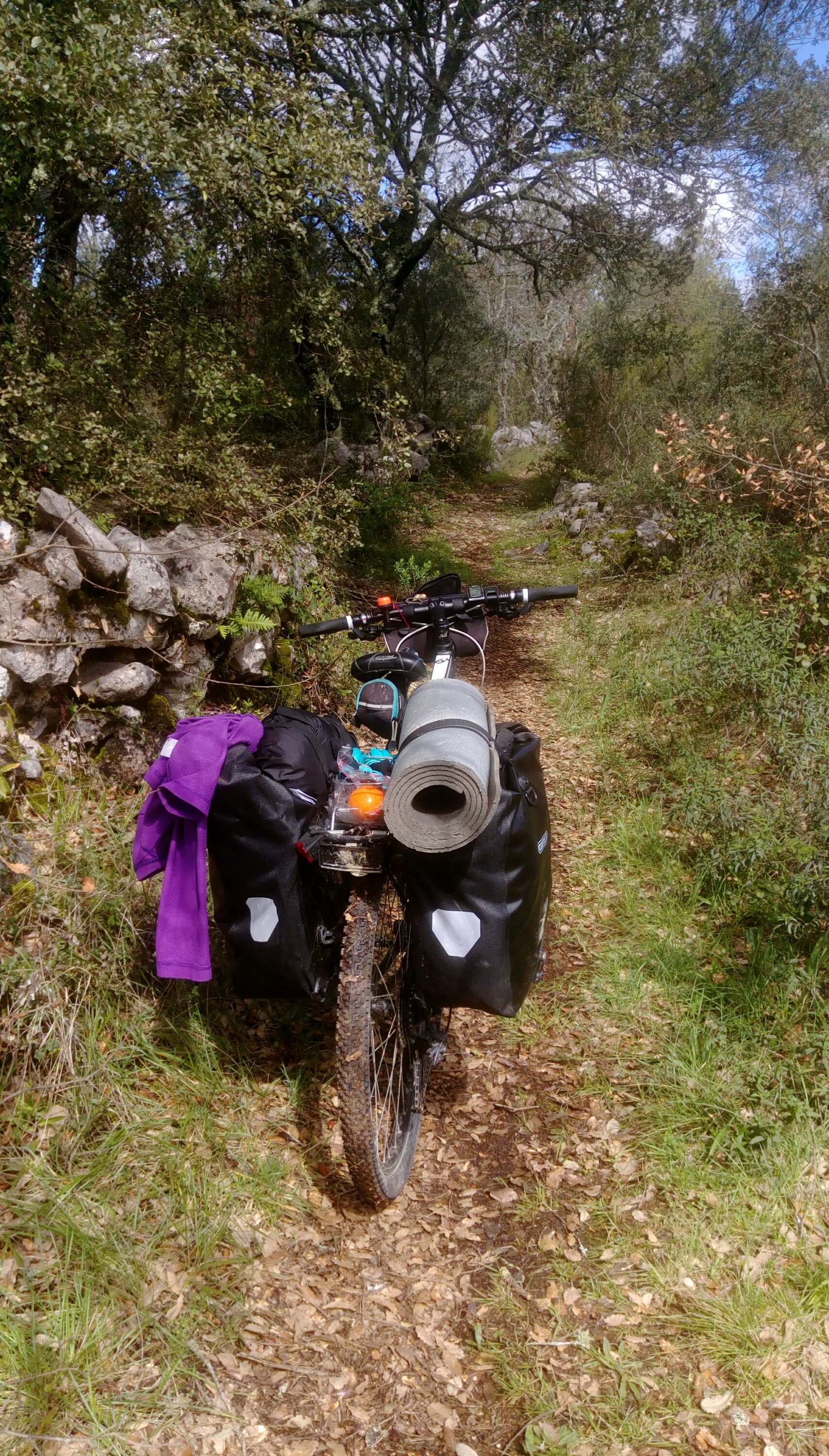 Sabemos que hoy el dia será duro, primero por un constante rompepiernas y segundo por el mal tiempo, pero ahi vamos, a la aventura. Sólo salir, nos metemos por un caminito empedrado, por donde pasa un riachulo .. así que toca bajarse de la bici y empujar. Encima nos empieza a llover de nuevo.