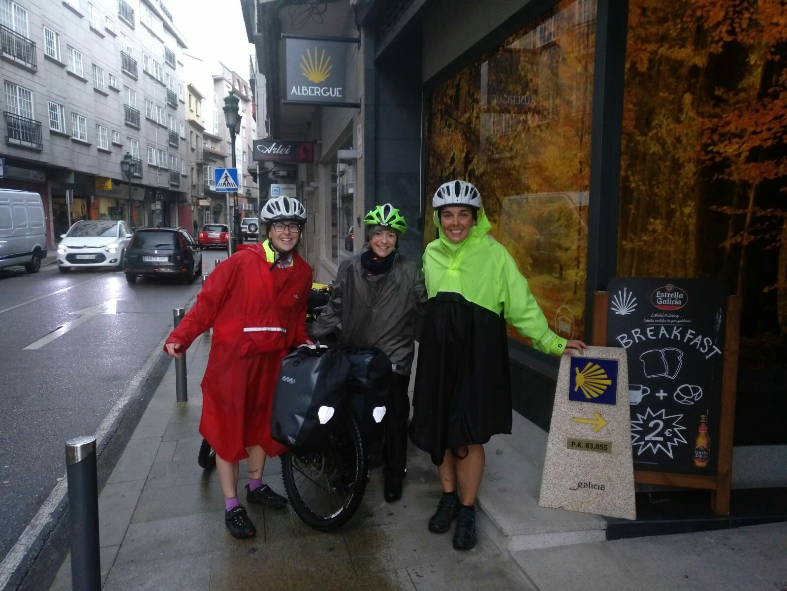 Son las 7.30 cuando nos levantamos, primera mañana en Galicia y ibamos convencidas que seria de día…pero no, aún es de noche (en Portugal si que era de dia!). Vemos que no llueve, así que nos apresuramos a montar alforjas y salir.