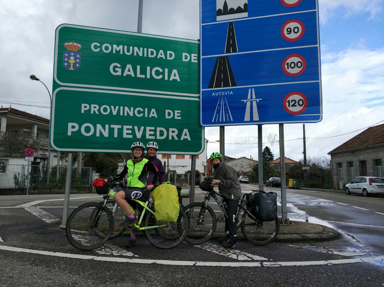 Empezamos la mañana por una pista asfaltada, rodeada de campos, casitas y con unas vistas inigualables. El dia se ha levantado más o menos despejado pero con mucho frio. El camino empieza a subir considerablemente hasta llegar a Brión, pueblo por donde pasa la vuelta a España en bicicleta. Como somos más chulas que nadie, decidimos que este puerto también lo queriamos hacer como ellos, pero con bici de montaña y alforjas. Y ahí estámos, pedaleando.
