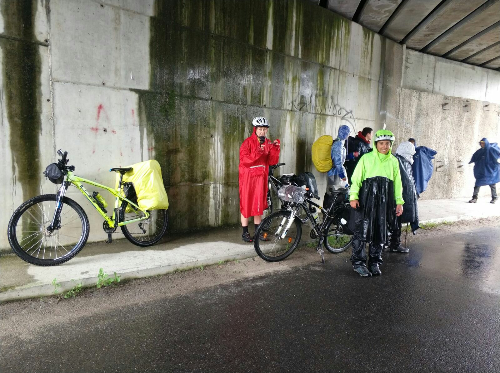 Vuelta al ruedo por un bonito caminito, pero de pronto vemos in flaix. Nos habran hecho una foto? No! Es un rayo y a los segundos suena el trueno. Empieza a llover a mares y nos cae mucho granizo. Que daño en las manos y en las piernas! Paramos bajo un puente para que cese.
