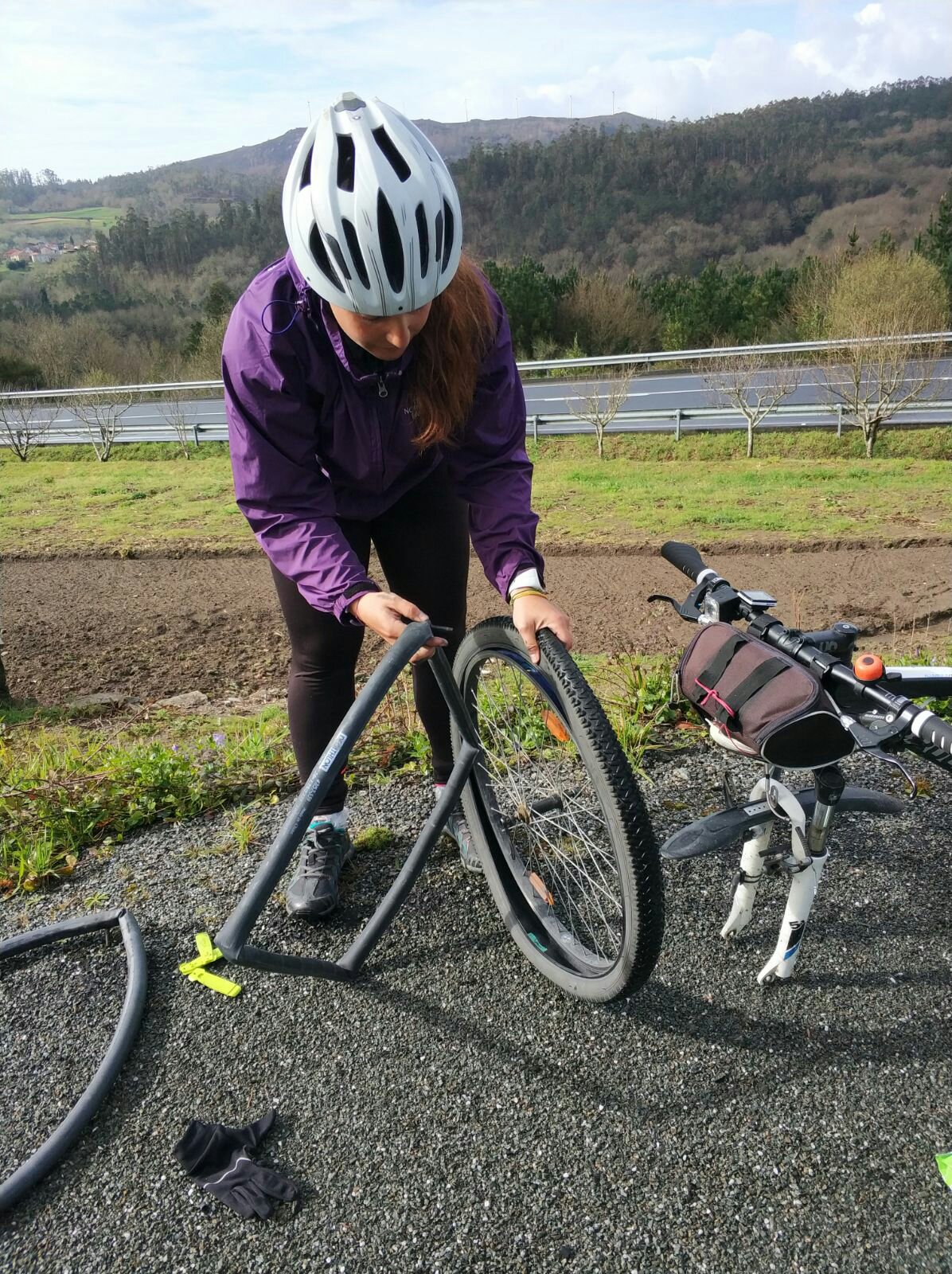 Al sacar las bicis, empieza a lloviznar y, encima, me doy cuenta de que mi rueda delante está pinchada. Manos a la obra. Sacamos la rueda, cambiamos cámara, un poco de aire y como nueva.