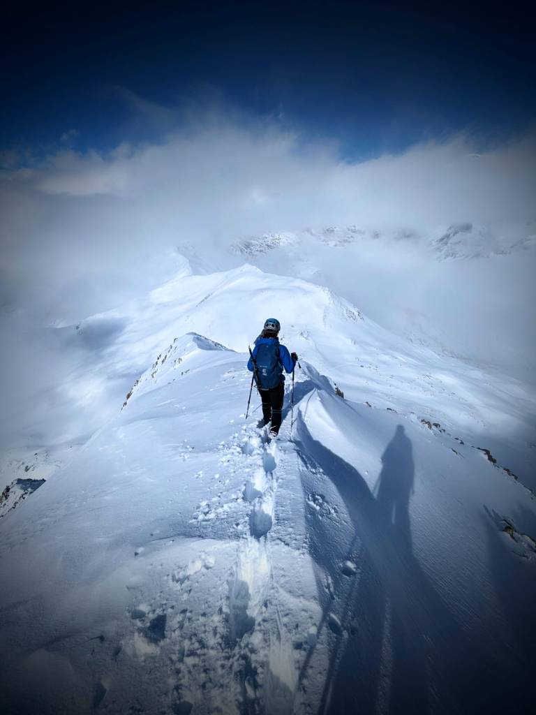 El camino desde la cabaña hasta la cumbre se hace un poco más complicado por la cantidad de nieve humeda que hay. Aparte, toca abrir camino y la nieve nos llega hasta las rodillas y, en ocasiones nos llegamos a hundir. El camino hasta la cumbre se hace lento, ahora bien, el paisaje es espectacular. Todas las montañas nevadas y, detrás nuestro, una preciosa traza que hemos ido creando a nuestro paso.