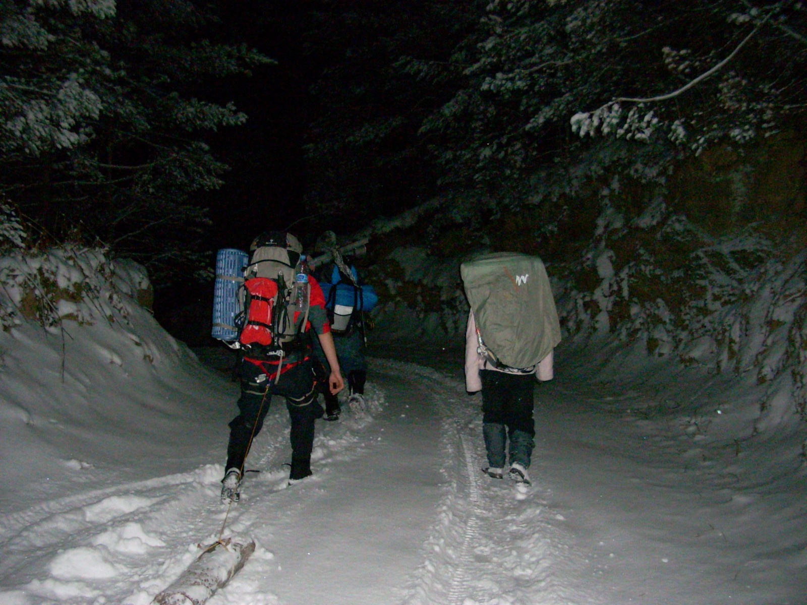 Llegamos al pueblo a eso de las 12 de la noche. hay pocas luces iluminadas pero sabemos bien el camino. debemos encontrar una pista forestal, que está cerca del cementerio. Esta nos llevará al refugio libre y no guardado Pla de Prats. Seguimos la ruta, sin dejar la pista en ningún momento. La pista es ancha y, a los pocos metros empezamos a encontrar capas de nieve. Seguimos caminando, hablando sobre a qué hora nos levantaremos la mañana siguiente para hacer la cima. Tenemos el mapa del recorrido marcado y sabemos que no hay mucho tramo hasta arriba, así que tampoco es del todo necesario madrugar.