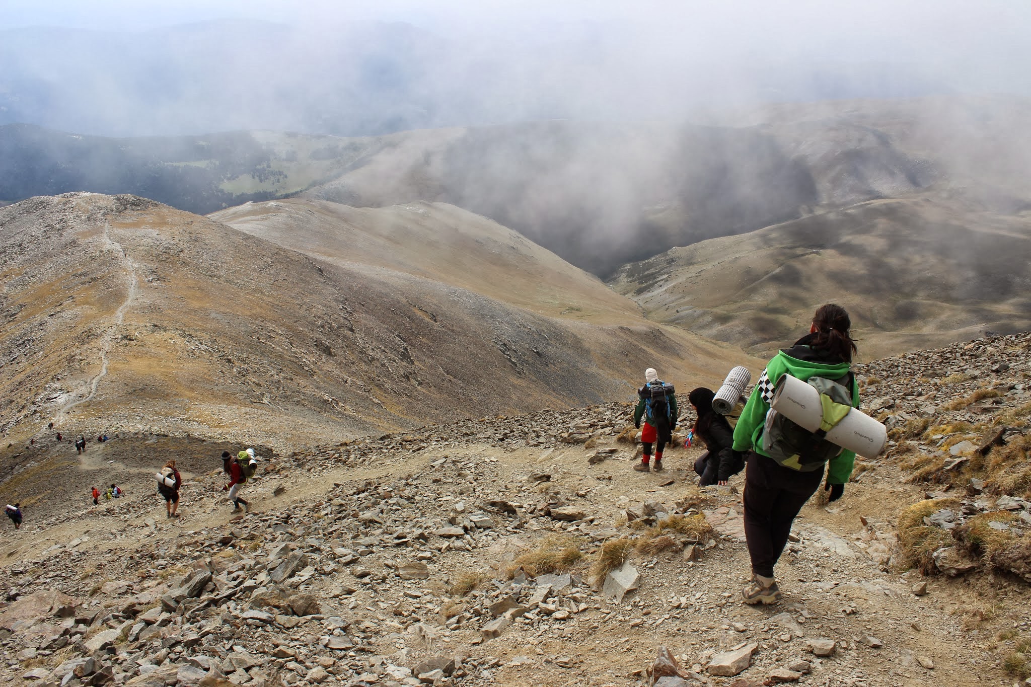 Al principio, la subida es un poco dura y más, si llevas todo el peso como hicimos nosotros. Luego el camino planea un poco más y poco a poco hace pendiente. Intentamos descansar en algunos puntos donde el fuerte viente no soplaba y el sol nos calentara un poco.